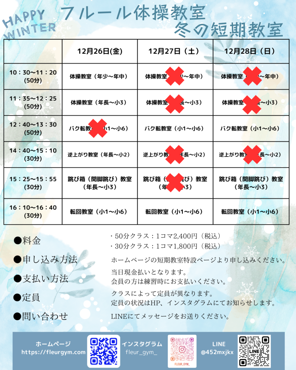 冬の短期教室 2025 2024年11月13日 最終更新日時 : 2025年12月23日 naoki 短期教室の申し込み期間が終了しました。 問い合わせなどは↓のフォームよりよろしくお願いいたします。 △は残り定員数が1名となっております。 短期教室の問い合わせはこちら↓ お子様の氏名 お子様の学年 メールアドレス 電話番号 参加希望クラスと日時(複数クラス受講希望の場合はすべてご記入ください。)