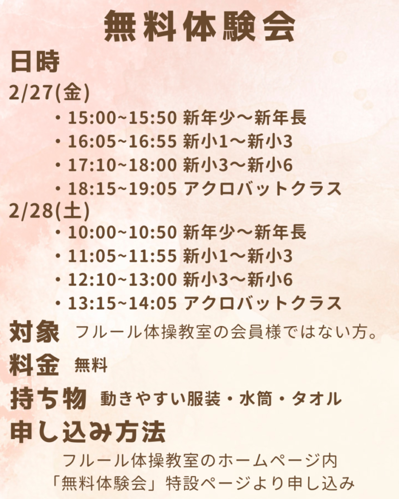 体験を希望される場合は下のフォームより申し込みいただくか、フルール体操教室のLINEをご登録いただき、メニューから体験の申し込みをお願いいたします。